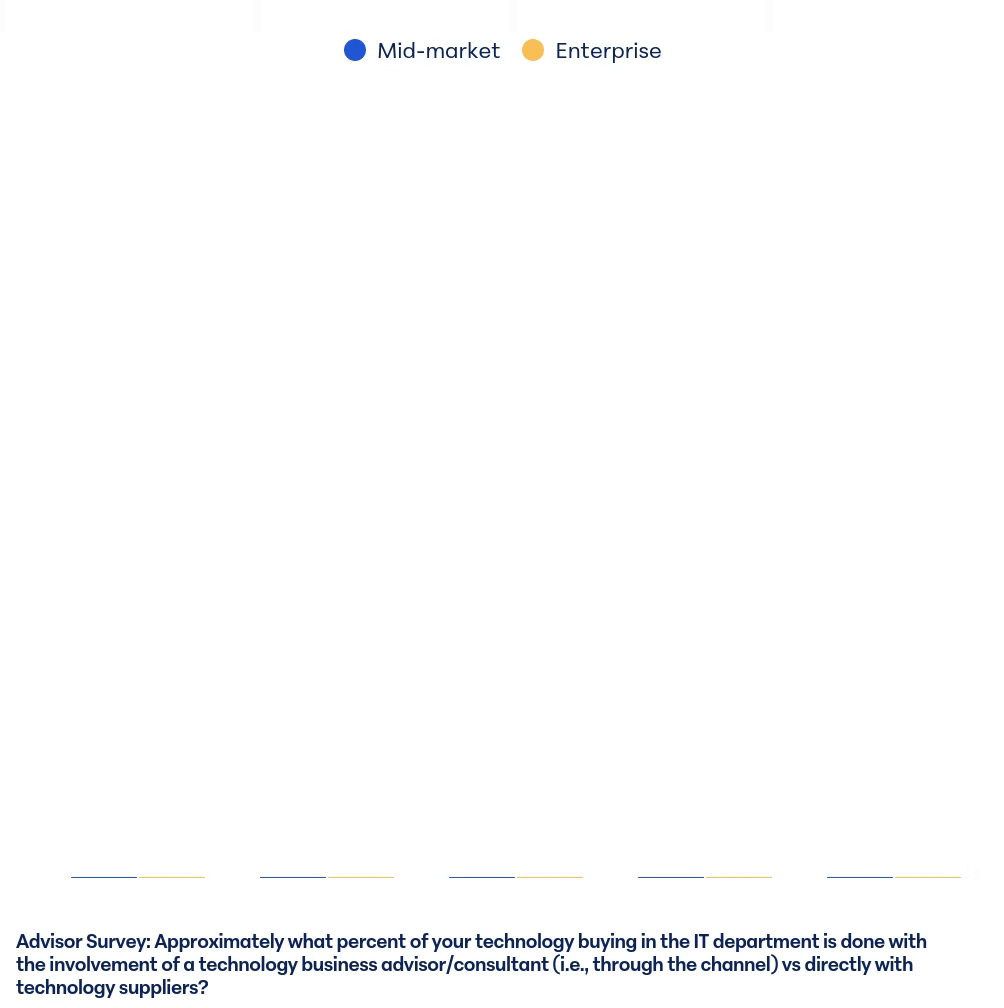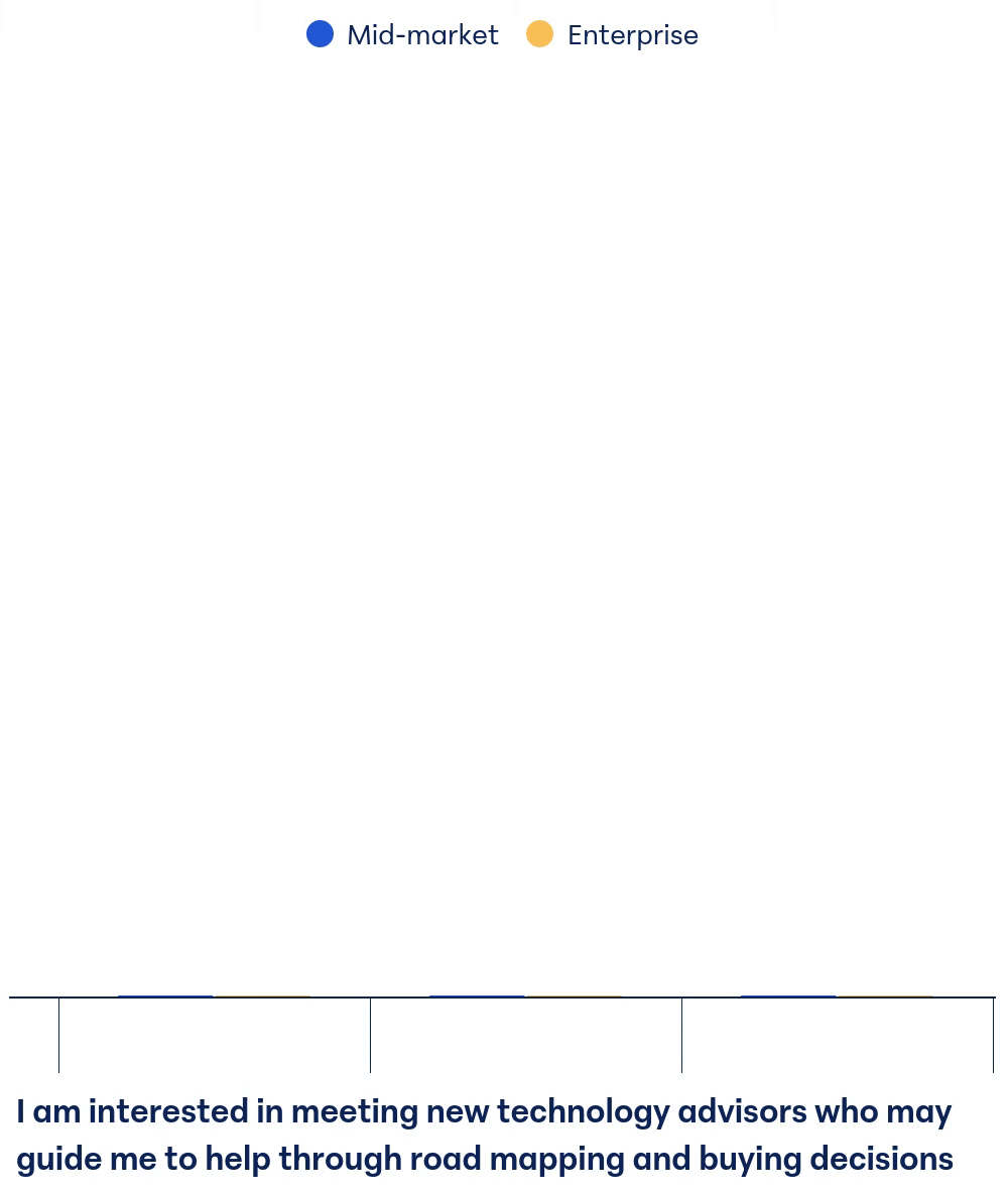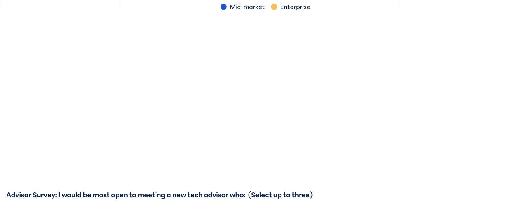 Mid-market buyers also tend to rely more heavily on advisor-led purchasing: 75% report that at least 26% of their tech buying is done through advisors and they are generally more open to meeting new technology advisors.