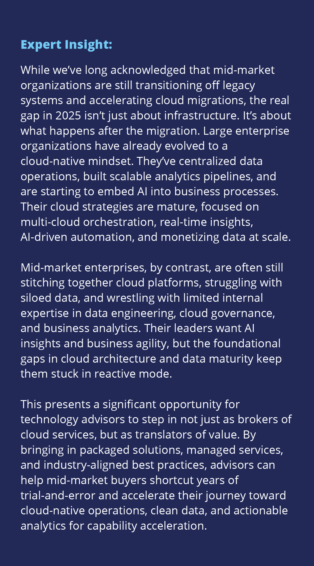 This openness reflects continued momentum from 2024, as AI adoption accelerates and mid-market organizations seek trusted partners to help navigate new risks, opportunities, and vendor choices. As tech complexity grows, many buyers are not just receptive—they're actively looking for advisors who can bring clarity and strategic direction.